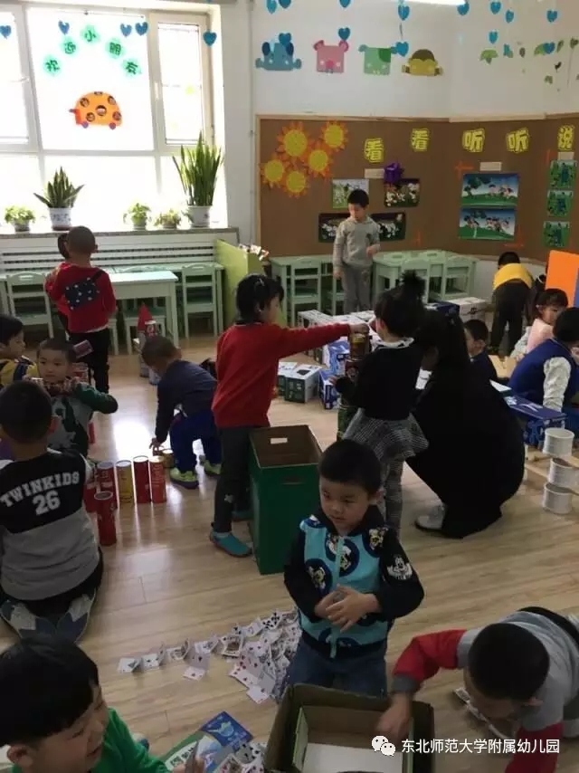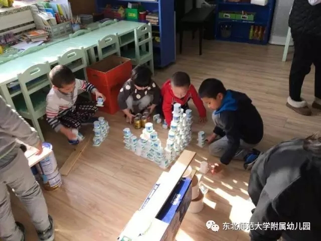 果果四班的哥哥姐姐给弟弟妹妹准备了很多的建构材料,孩子们第一次在幼儿园看见这么多可以搭建的材料:牛奶箱、酸奶盒、扑克牌、薯片罐子、饮料罐以及木板。“哇,这么多的建构材料,要怎么玩呀?”孩子们纷纷质疑,这时哥哥姐姐过来拉过弟弟妹妹们的手,走到相应的建构材料区进行游戏。
